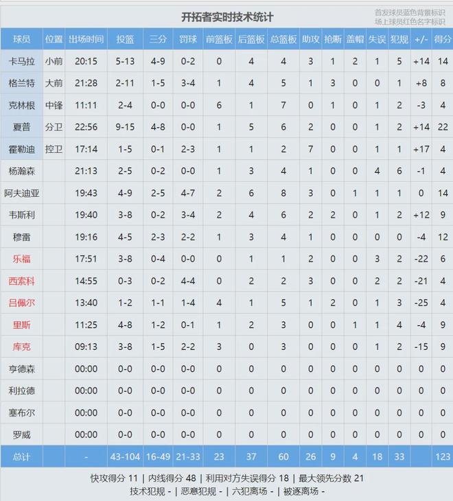 上半場打完,開拓者73-57領(lǐng)先勇士16分。夏普20分3板2助、阿夫迪亞13分6板2助、卡馬拉12分3板2助。勇士這邊,巴特勒12分2板3助2斷、庫里11分4板3助。楊瀚森打了10分鐘,1投0中,得到0分1板1助2失誤1犯規(guī),正負值+3。